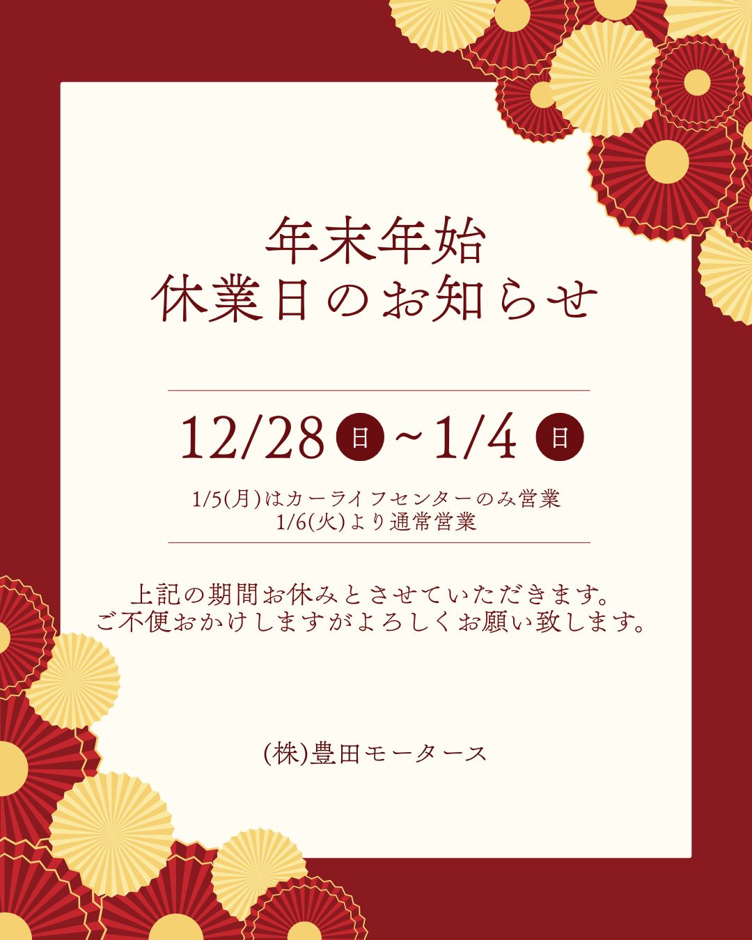 1月5日(月) :カーライフセンターのみ営業